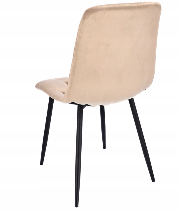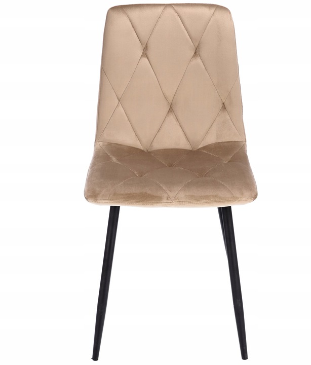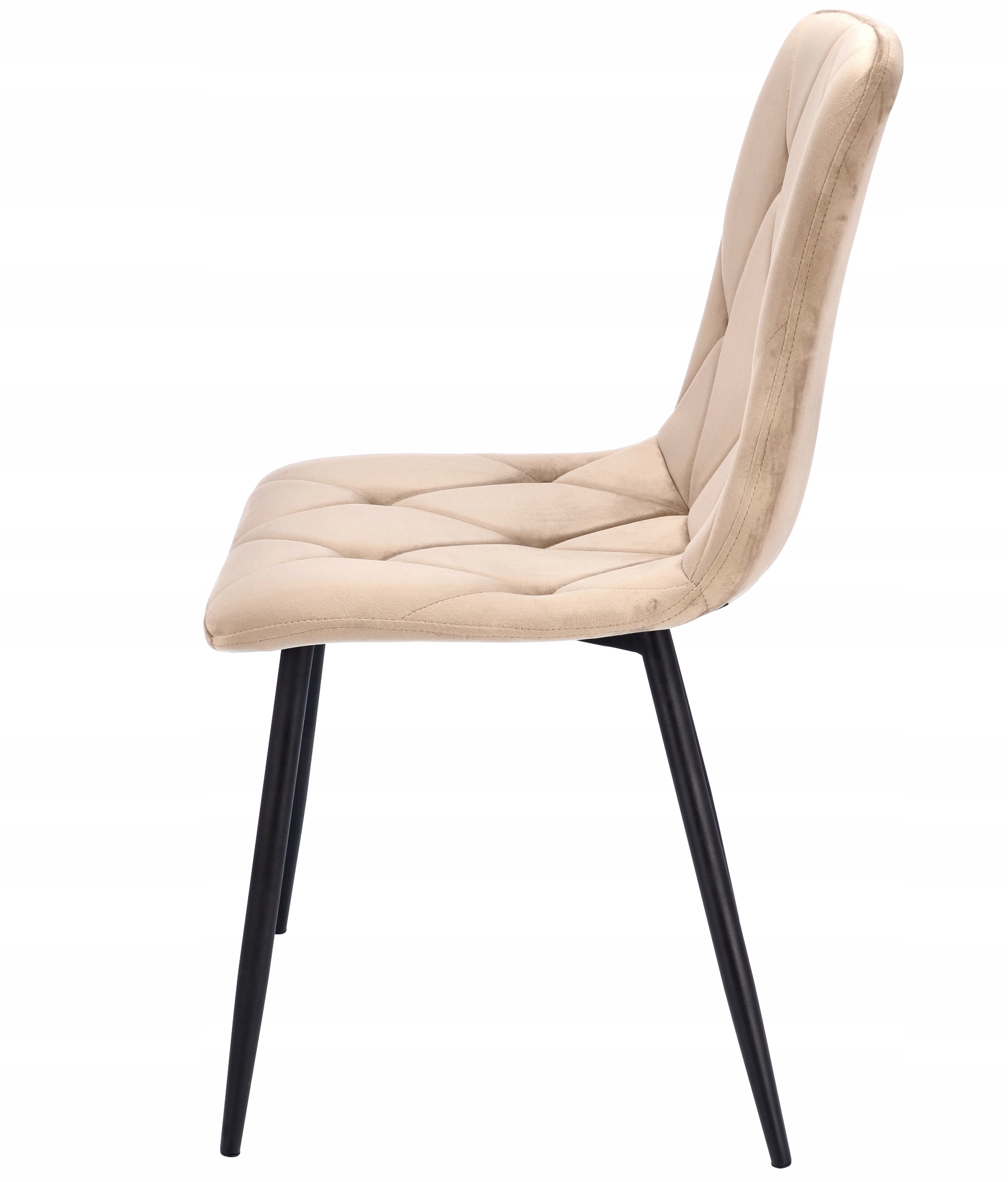 Krzesło tapicerowane jest welurem, a po wewnętrznej stronie pikowane regularnymi przeszyciami w romby. Wysokie i smukłe nóżki w czarnym kolorze wyglądają bardzo szykownie oraz gwarantują idealną stabilność.