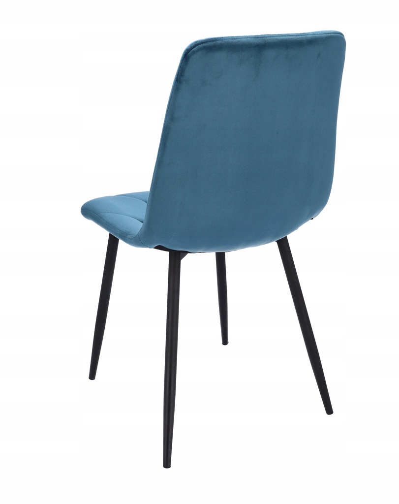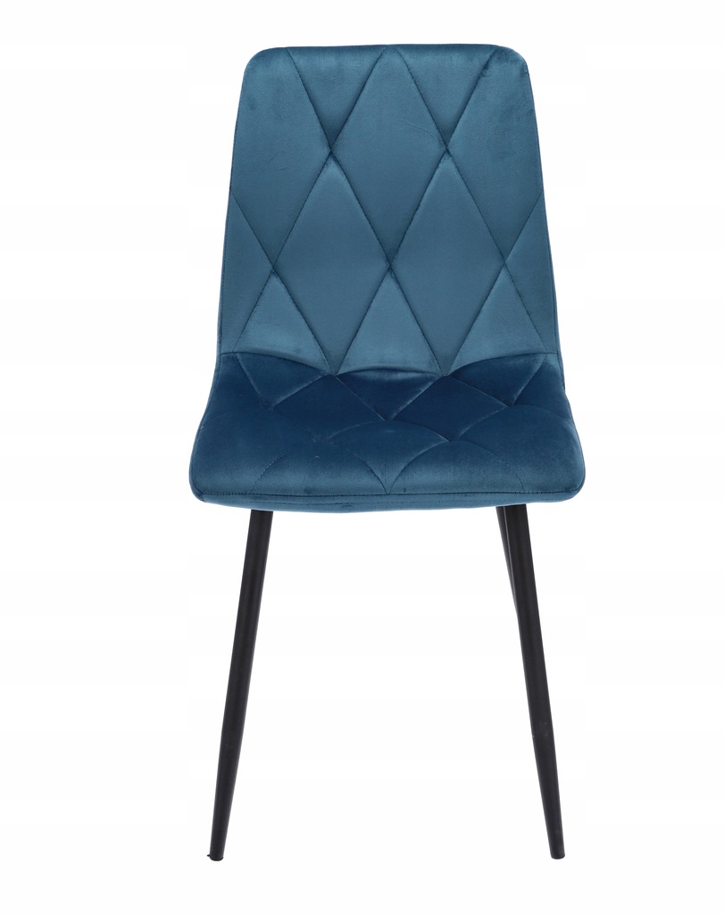 Krzesło tapicerowane jest welurem, a po wewnętrznej stronie pikowane regularnymi przeszyciami w romby. Wysokie i smukłe nóżki w czarnym kolorze wyglądają bardzo szykownie oraz gwarantują idealną stabilność.