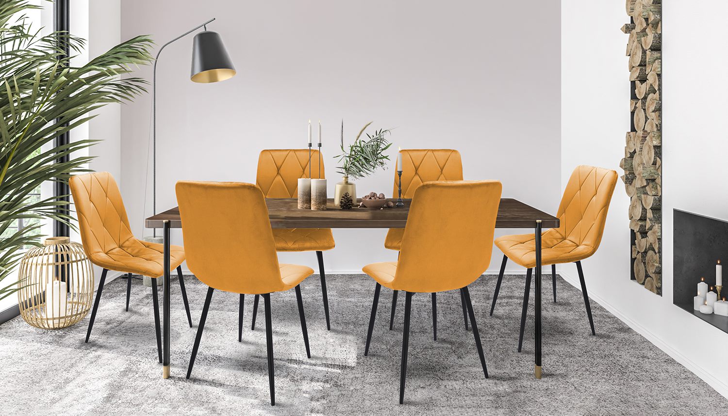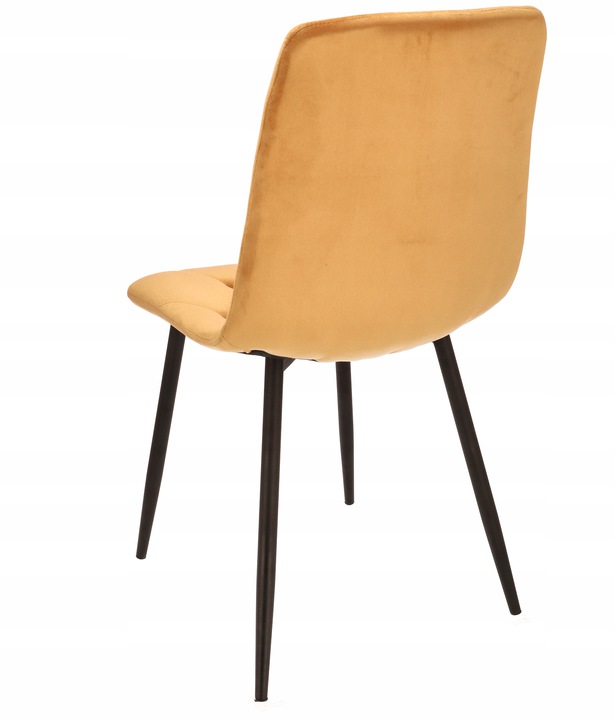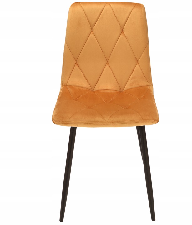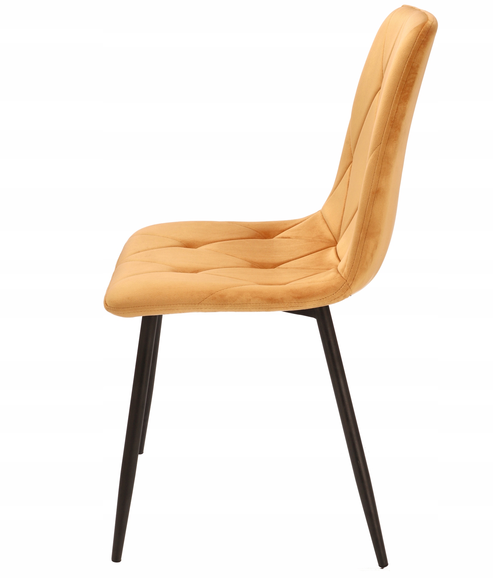 Krzesło tapicerowane jest welurem, a po wewnętrznej stronie pikowane regularnymi przeszyciami w romby. Wysokie i smukłe nóżki w czarnym kolorze wyglądają bardzo szykownie oraz gwarantują idealną stabilność.